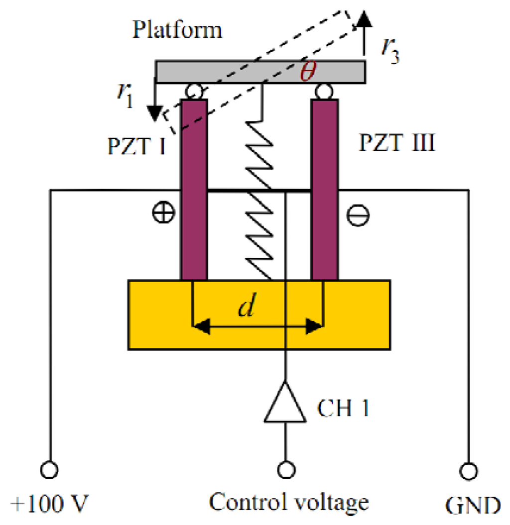 The working principle of the proposed piezo-based platform is different from that of other piezo applications. First, a preloading spring is used to maintain the structure stability. Then, a constant voltage and two varying inputs are used to drive four independent piezo stacks. The working principle of the piezo-based platform in X-axis is shown in Figure 3, where θ, r1 and r3 are the tilt angle, the translational displacements of PZT I and PZT III, respectively. A constant voltage +100 V is added to PZT I. Thus, the input voltage of CH 1 can be used to drive both PZT I and PZT III to produce the tilt angle θ.