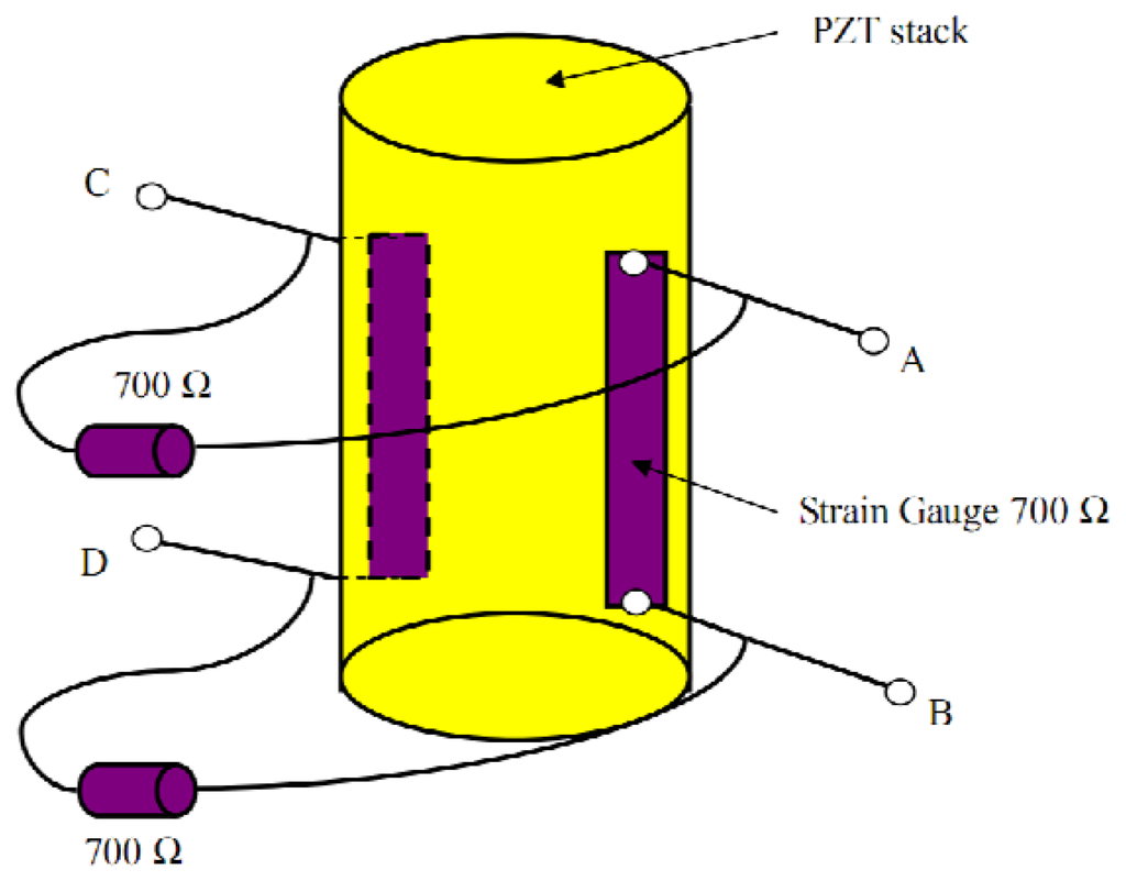 SGS sensors are widely applied to measure piezo displacements. In this paper, one piezo actuator (PZT stack) is used to show the measuring principle of SGS sensors. Two resistive films are bonded to the PZT stack, as shown in Figure 5. The length change of the piezo stack alters the resistive of the strain gauge. The resistive change is proportional to the displacement of the PZT stack. Moreover, a Wheatstone electric bridge, which consists of two strain gauges on the PZT stacks and two resistors on the PZT housing, is employed to get better stability and resolution.