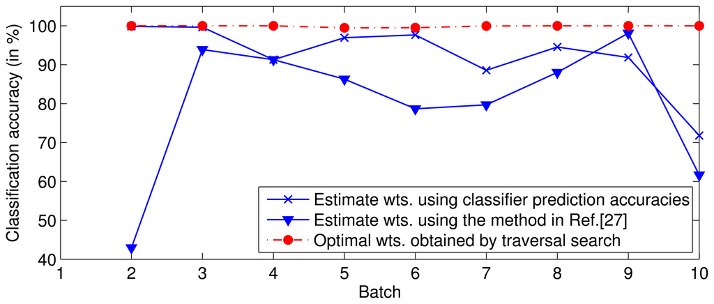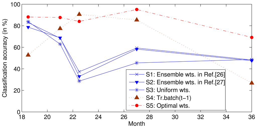 To survey the influence of the relative drift, we used the same data and features as those used in a previous study [26] to complete the following experiment. We trained SVMs on batches S1–5 and then tested batches S6–10 using uniform weights (Setting 3) or a set of weights estimated using batch S5 with the methods proposed in [26,27] (Setting 1 and 2). To determine the best prediction performance of ensemble f1–5, we determined the traversal search sets of the optimal weights for each classifier in batches S6–10 (Setting 5); the ensemble classifier was found to perform with the greatest accuracy where the search range for each weight was [0,1] and the search step was 0.01, due to calculating time pressure. In addition, to verify the above assumption, we trained a classifier with data from only the previous batch and tested it on the current batch (Setting 4). The classification accuracies are shown in Figure 2, where the horizontal axis represents the mean time at which the data for each batch was collected. Note that the performance under Setting 4 is typically not the best. This non-ideal performance illustrates that the ensemble of the earlier SVMs with advisable weights can perform better than the SVM trained by only the previous batch. The optimal weights for each batch are obtained under Setting 5, and the performance is theoretically the best that can be obtained by class ensembles when {X1–5, Y1–5} and X6–10 are known and Y6–10 are unknown.