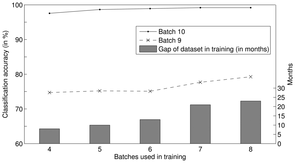 In the DWF approach, the weights in the test step are predicted by fitting functions, and the time span of the training dataset can affect the fitting result. It follows that the time span of the training dataset can affect the performance of the DWF approach. To verify this inference, we analyzed the impact of the time span on the classification accuracy in a set of experiments. We trained sets of SVMs using the datasets of different time spans for batches S5–8, S4–8, S3–8, S2–8, and S1–8, and combined five classifier ensembles, which are composed of four, five, six, seven and eight SVMs, respectively. Then, based on the DWF method, we predicted the weight of each SVM at the times of batches S9 and S10 and tested these predictions. Figure 4 illustrates the performance of each ensemble, where the histogram presents the time span of the training datasets of each ensemble, and the two profiles illustrate the classification accuracies of each ensemble tested on batches S9 and S10. The classification accuracies were found to increase as the time span of the training dataset increased, and the classification accuracy increased more substantially as the time gap between the training and test datasets increased. In conclusion, the performance of the DWF method can be improved by increasing the time span of the training dataset; in other words, the DWF approach can mitigate the drift effect for a longer period of time when the time span of the training dataset is increased.