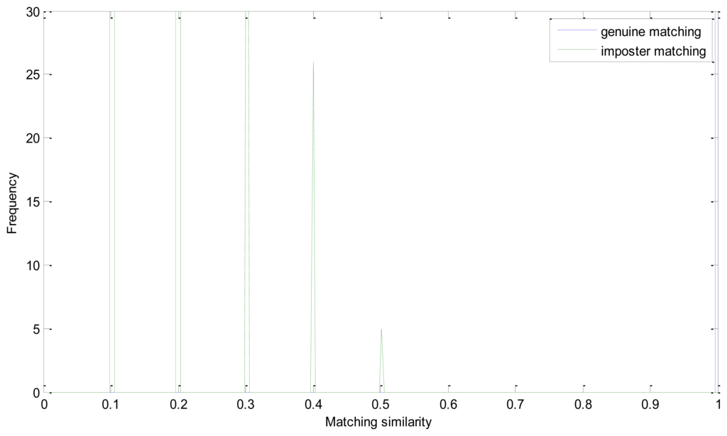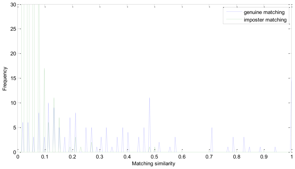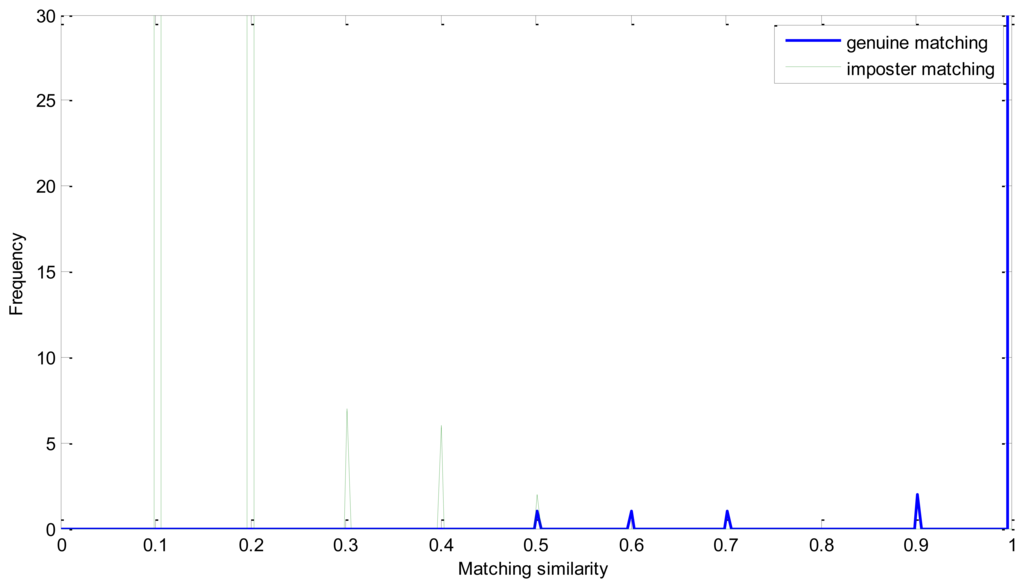 In Equation (14), Sg and Si represent matrix of the number of matching pairs of the genuine and imposter matching, respectively. Apparently, Sg′ ranges from 0 to 0.5 and Si′ is mainly between 0.5 and 1. And if the EER is zero, all of the number in Si′ must be larger than 0.5. From Figure 8, we can see that the similarity of the imposter matching is between 0 and 0.5, and the genuine similarity is larger than 1. These two distributions have no intersection and there is a large margin between the two similarity distributions.