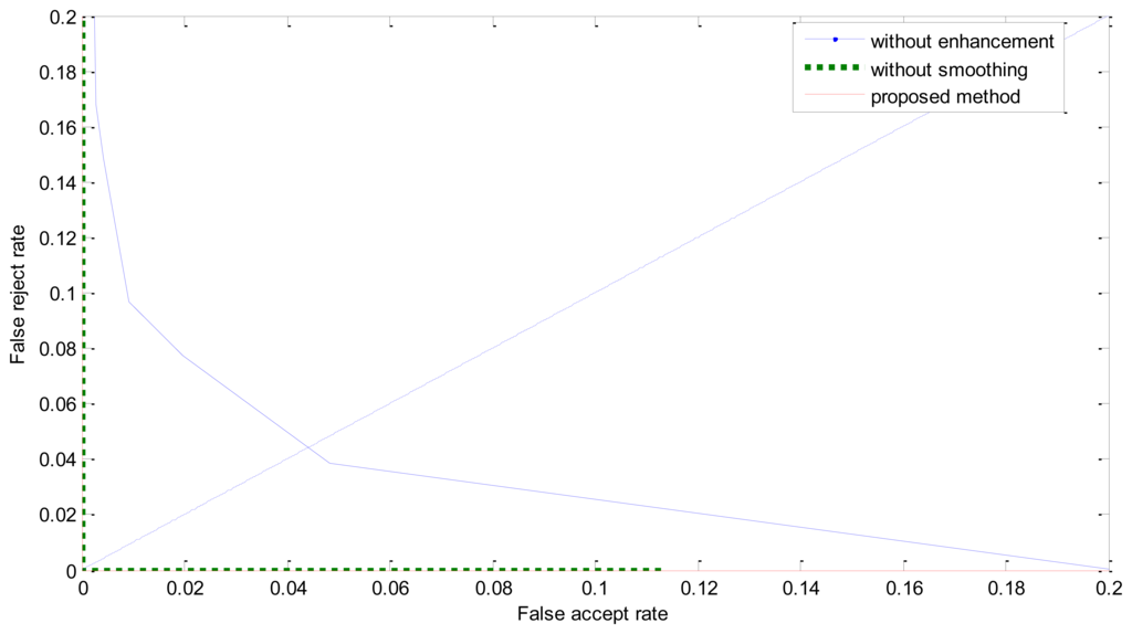 The ROC curves are shown in Figure 11. The FRR at zero FAR and FAR at zero FRR values are listed in Table 1. From Figure 11 and Table 2, we can see that the proposed method achieves a much lower EER. This indicates that the enhancement method introduced in this paper is effective. From Figure 8 we can also see that the proposed method has potential robustness for larger databases because there is a large margin between the genuine and imposter matching.