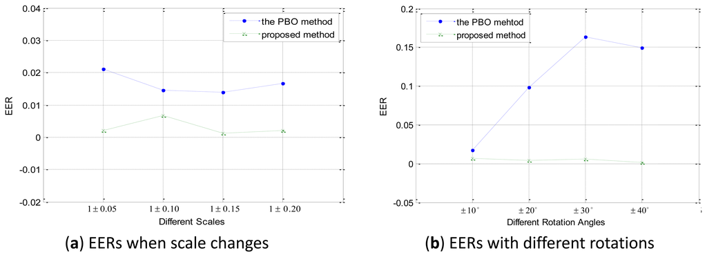 To test the robustness to scale changes and rotations of the proposed method, we conduct Experiment 3 on the secondary database in the verification mode. As mentioned in Section 4.1, each secondary database includes retina images from the primary database and a simulated datasets and every class has at least six samples. We use full matching, and consequently, there are 1,854 intraclass matching and 103,257 interclass matching in total. Figure 13 shows the EERs of the proposed method on each secondary set, respectively. From the figure we can see that, for the proposed method, though the values of EER varies according to rotations or scale changes, all the values of EER is no bigger than 0.0065 which indicates that the proposed method is robust to rotations and scale changes. While due to the lack of robustness of rotations or scale changes, which are common deformations in normal retina images, the performance is of the PBO method changes dramatically.