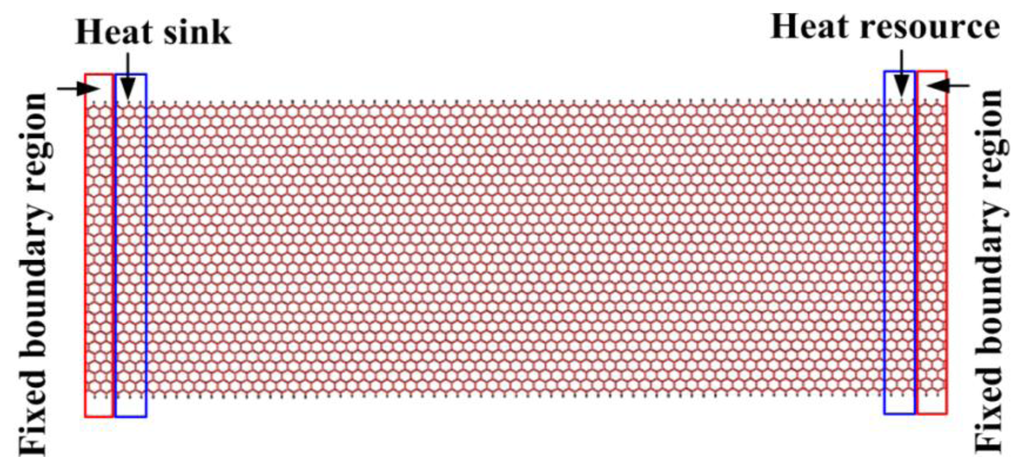 Figure 1 shows the model for a GNR with a size of 16 nm and 6 nm in length and width, respectively. The size of the model in our work is relative large in comparison to that of the literature [8,9,14,15,23]. In order to avoid the contraction of the stretched GNRs, the boundary conditions constraining the displacement along the length direction were applied, as shown in Figure 1. Also, to make the thermal transfer along the desired temperature gradient imposed by the NEMD approach, a heat sink (≤0.5 nm) with a temperature of 300 K (Tsink) was applied on the left. On the right, a heat source with a temperature of 500 K (Tresource) was applied. Then the response as the resulting heat flux was measured.
