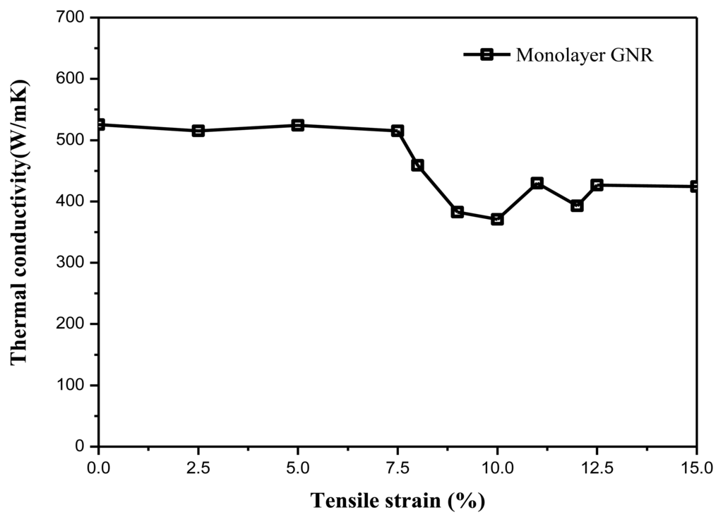 MD simulation results show GNRs with different tensile strains have different thermal conductivities. In Figure 2, while the tensile strain varies from 0% to 7.5%, the thermal conductivity basically remained stable at about 525 Wm−1·K−1. Then the thermal conductivity begins to rapidly decrease to 371 Wm−1·K−1 while the tensile strain changes from 7.5% to 10.0%, which is almost 30% smaller than that of a strain-free GNR.