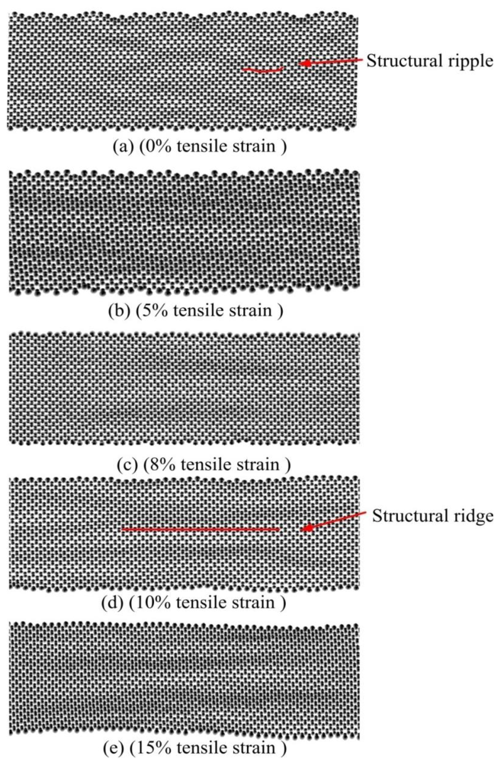 For the train-free GNR, MD simulations show that there are some structural distortions on the graphene surface that look like ripples (in Figure 2a), that is graphene roughness, which seemed to be a necessary condition for the existence of single layer graphene [24]. The therrmal environment and heat conduction induce vibration on GNR atoms. This GNR atoms’ vibration engenders an undulation of the molecular potential energy described by the COMPASS force field. Graphene surface ripples also move up and down in this thermo-motion MD simulation. In some other MD simulation studies of graphene thermal conductivity by using other MD force fields, graphene atomic configurations do not have observable ripples. This means the COMPASS force field has higher accuracy in prediction of graphene structural variation in comparison with other force fields. The COMPASS force field is thus suitable for studying ripple formation triggered by tensile train.
