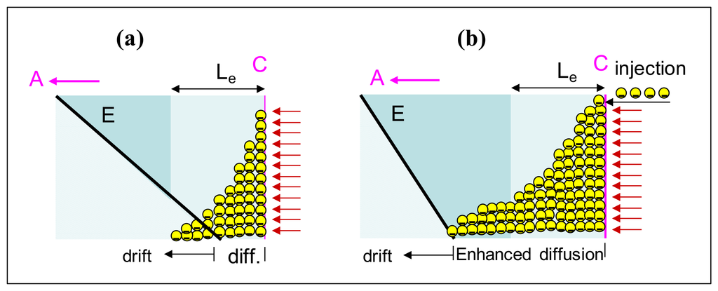 The subsequent increase observed in current transients is still related to electron injection and trap filling: when the low field region becomes comparable or even greater than Le, photo-generated electrons are hardly extracted; this can favour the filling of trap centres and then the increase of τe. To some an extent, this mechanism should increase the effective diffusion length inside the region close to the cathode (Figure 10b).