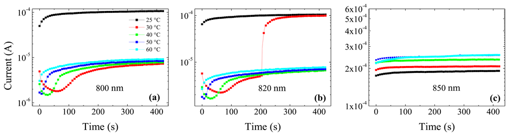 As already mentioned, the current transient at 25 °C (Figure 9a) shows around 320 s an abrupt increase, which is definitely greater and steeper with respect to the smooth increases observed at the other temperatures. Such a feature, also observed for the 800 and 820 nm irradiations, is quite reproducible and it is probably still related to trap filling effects. After the seminal works of Lampert [29] and Rose [30] it is well known that current-voltage characteristic is profoundly affected by the crossing of a trap level by the Fermi level, that is, by the filling of a set of traps. Our results seem to indicate that such effects can also be observed in the time domain.