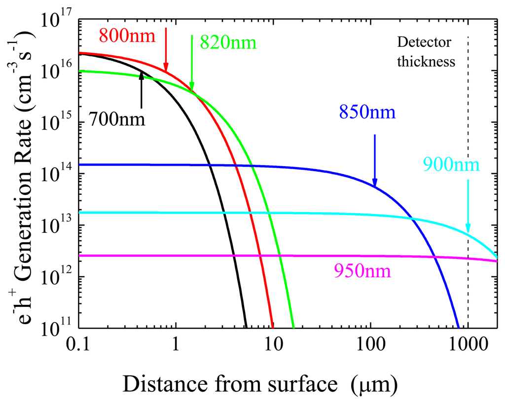 Clearly, we are overestimating the actual carrier generation inside the detector because of the reflection from the surface and, overall, because of the optical attenuation from metal contacts, which is unknown. Hence, the rate G reported in Figure 2 has the only aim to highlight the relative variations of the carrier generation rate and the range of penetration depths at different wavelengths.