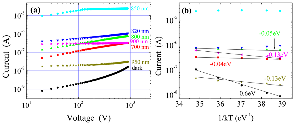 Photocurrent-voltage characteristics at 25 °C, under different perturbation wavelengths, are reported in Figure 4a. For all the curves, the dark current has been subtracted from the total measured current. From Figure 4a it can be seen that the photocurrent increases with the wavelength up to 850 nm, where the greatest values are measured. The photocurrent correlates well with the electric field perturbation: both of them increase with the wavelength since, at wavelengths more and more penetrating, a greater number of photo-generated carriers becomes effective. At 700 and 800 nm, we observe a photocurrent increase with the square root of the voltage; then the slope decreases at 820 nm and it nulls at 850 nm, where saturation occurs already for V > 100 V.