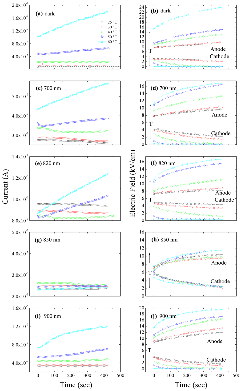In Figure 5 we report current transients and corresponding transients of the electric field at the anode and the cathode, for different temperatures and wavelengths. In a recent paper [27] we have shown that under dark conditions a strong correlation comes out between the current and the values of the electric field at the electrodes. Whenever the field near the Ohmic contact is not negligible, electrons will be injected, and drifted away by the field, thus becoming the main contribution to the flowing current. The transient regime originates from the deep level carrier emission which causes the electric field to become steeper. This corresponds to the decrease of the current and of the electric field at the cathode observed in Figure 5a,b for temperatures lower than 40 °C. For higher temperature, the transient increase of the current has to be connected to the considerable field enhancement at the anode. This makes predominant the hole contribution through the field dependent barrier height, as explained in Reference [27]. Under illumination, due to the large number of photo-generated carriers, photocurrent is much higher than dark current. Nonetheless, it is observed that a correlation still exists between the photocurrent transients and the field transients near the electrodes. At 700 nm (Figure 5c,d), it can be inferred that the current transients, even if quite limited, are related to the field at the cathode: at 25 °C and 30 °C both the field at the cathode and the current decrease. At higher temperature, 40 °C, after about 300 s, the field at the cathode becomes negligible: the current consistently shows a decrease in the first 200 s; then, as soon as the field at the cathode becomes pretty low, the current starts to increase (as a consequence of a field increase at the anode). At 50 °C we observe a similar behaviour, with the field at the cathode becoming negligible at about 50 s and the current showing a minimum few seconds before. At 60 °C the field at the cathode is already negligible at the starting time and the current thus increases, like the field at the anode. Similar phenomenology has been observed for the irradiation at 800 nm (not shown) and 820 nm (see Figure 5e,f). It is remarkable that electron injection at the cathode still affects the flowing current even when current is much larger than in the dark, and mainly due to the photo-generated holes drifting from the irradiated anode.