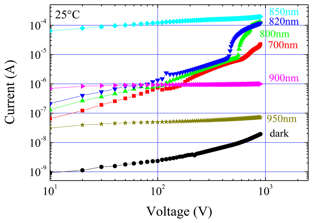 In Figure 7 the room temperature photocurrents as a function of the applied voltage are reported for different wavelengths. Likewise anode irradiation case, dark current values have been subtracted from all the other curves. As expected, at 900 and 950 nm photocurrents are comparable with those corresponding to the anode case. At the other wavelengths, several important differences are evident with respect to the anode irradiation case. At the lowest wavelengths (700, 800, and 820 nm), depending on the wavelength, a kink is evident in the curves between 400 V and 600 V.