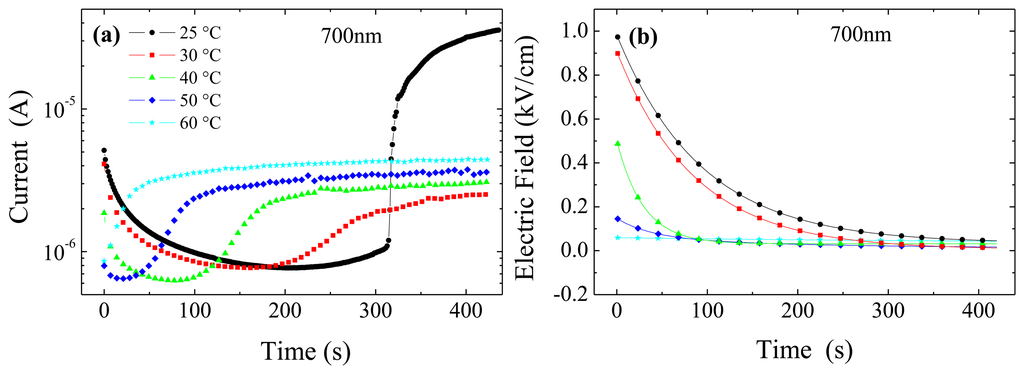 As previously seen, the field at the cathode is negligible and therefore no apparent correlation exists with the photocurrent; however, the field distribution is changing with time, by recoiling from the cathode side and hence increasing at the anode side. A careful data inspection reveals that the initial decrease of the current closely resembles the decrease of the electric field at a specific distance from the cathode. In particular, Figure 9b, shows that both the time constant and the amplitude of the electric field at 60 μm from the cathode are remarkably correlated to the initial transient of the current.