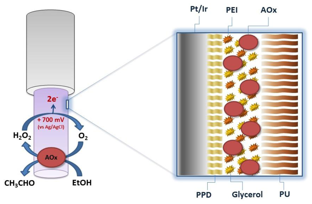 Ethanol is a ubiquitous psychoactive agent in Western society. Its effects are mainly associated with the modulation of GABAergic and glutamatergic systems; moreover, the positive reinforcing properties of ethanol are related to activation of dopaminergic pathways, producing dopamine release in the nucleus accumbens. In view of these neurobiological aspects, the detection of ethanol in brain extracellular fluid (ECF) is of great importance. Several studies in the literature have reported ethanol pharmacokinetics and concentrations in the brain after systemic injection, and showed that ethanol in the CNS could reach concentrations of about 30 mM [1–4]. In all those papers, neither “real-time” techniques nor implanted biosensors were used. In a previous paper [5], we introduced a biosensor suitable for monitoring ethanol concentration in brain in real time. In that study, different designs were investigated, all manufactured using a fixed concentration for enzyme stock solution (200 U·mL−1 of alcohol oxidase), and we also investigated the role of polyethyleneimine or glycerol (or a combination of both) as enzyme enhancers and stabilizers. In choosing the best design for in-vivo implantation, studies were also performed on the interference due to electroactive molecules present in brain ECF, mainly represented by ascorbic acid (AA). Starting from our previous findings, different designs of alcohol biosensors were developed and characterized in this study, using stock solutions of different enzyme concentrations. Again, the biological component, used as the sensing element, was the enzyme alcohol oxidase (AOx; EC 1.1.3.13), a flavoprotein with eight subunits, each containing a flavin adenine dinucleotide (FAD) cofactor molecule that plays a pivotal role in the enzyme activity (Reaction (1)). AOx is capable of catalyzing the oxidation of primary, aliphatic short-chain alcohols (such as ethanol and methanol) to their respective aldehydes as follows: