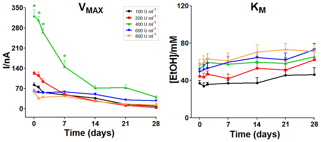 In order to enhance ethanol biosensor performance, different enzyme loadings were investigated in terms of apparent ethanol Michaelis-Menten kinetic parameters, IMAX and KM, the LRS and enzyme oxygen dependence. In all designs, 10 quick dips were performed using different enzyme solutions, the concentration of which ranged from 100 to 800 U·mL−1.