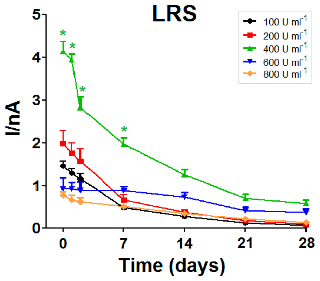 The responses of biosensors over time were assessed over a period from day 0 up to day 28. IMAX, KM, LRS, AA ΔI and AA 1 mM current (data not shown) were monitored in vitro as described in Section 2.2. Unsurprisingly, all the selected designs showed a global, rather homogeneous, decay in terms of IMAX (Figure 2, left panel). However, only the design made with the 400 U·mL−1 enzyme solution showed IMAX values higher to other designs, remaining so up to day 21.