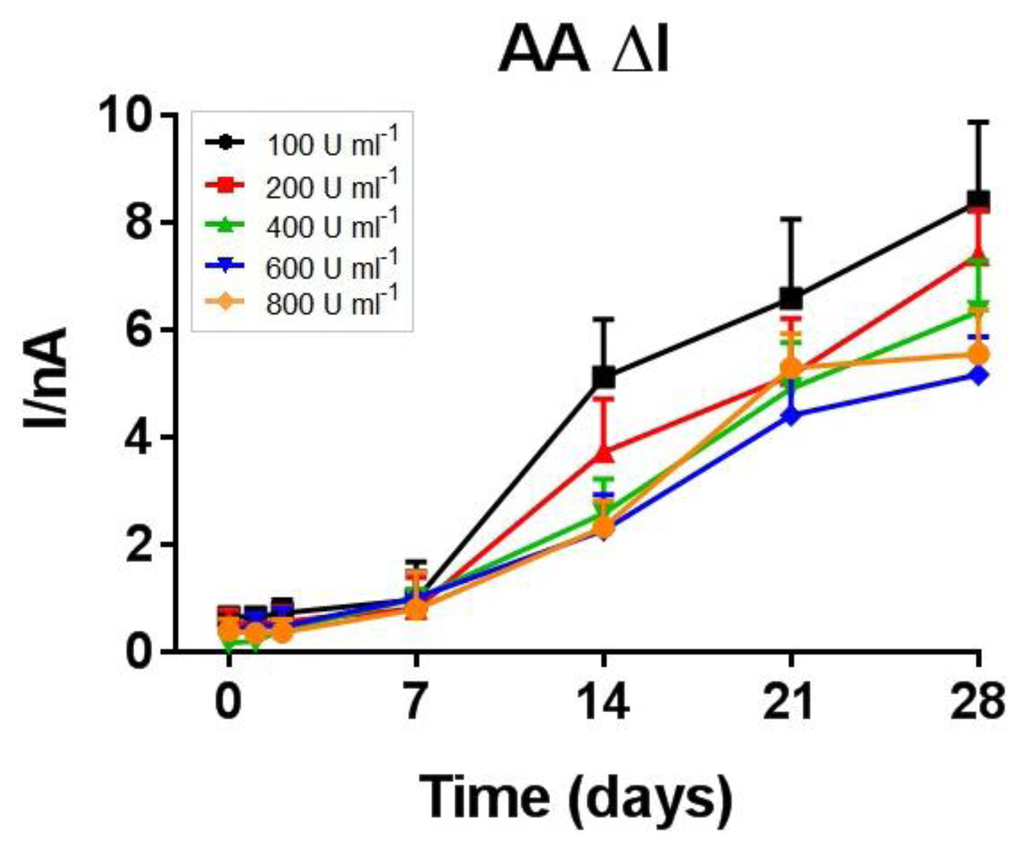 Ascorbic acid interference, measured during the entire 28-day period and expressed as AA ΔI (Figure 4), was similar in all studied groups up to day 7 (0.47 ± 0.04 nA; n = 20); after the first week all the studied groups showed an increasing sensitivity to AA with an observed slope between 0.21 ± 0.03 nA day−1 (600 U·mL−1) and 0.34 ± 0.06 nA day−1 (100 U·mL−1).