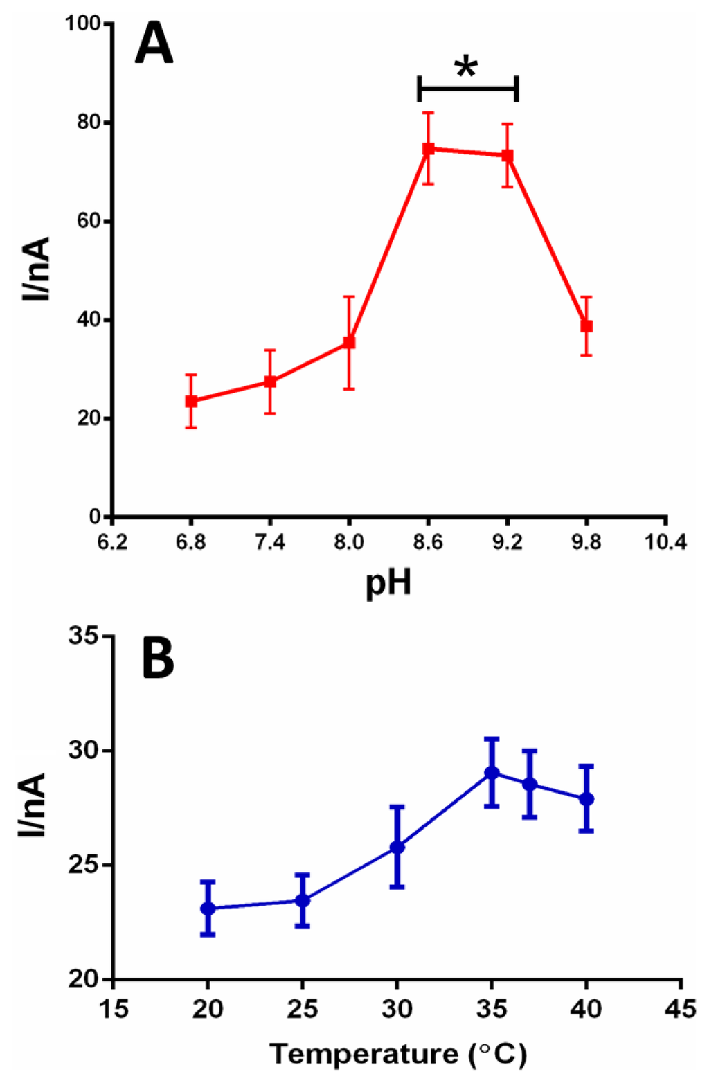 The pH-dependence results demonstrated that the enzyme exhibited quite a stable response at physiological concentrations of H+ (in the brain) in a range comprised between pH 7.36 and 7.42; pH values between 8.6 and 9.2 resulted in the best biosensor performance in agreement with previous studies [16].