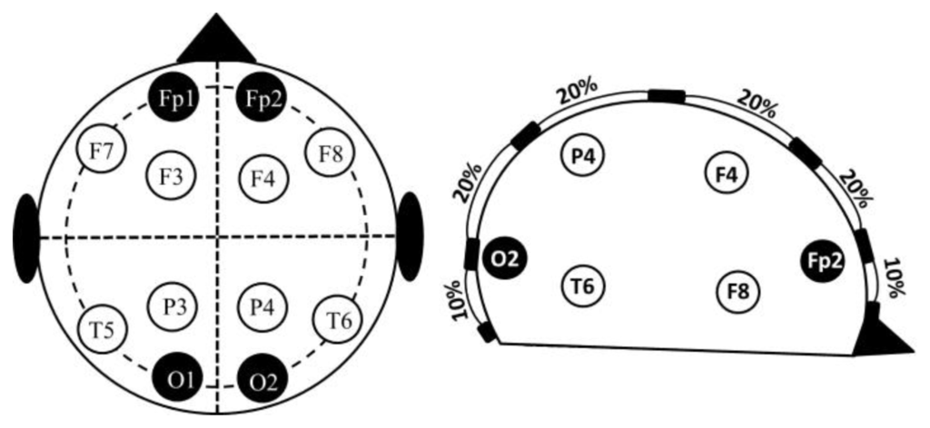 The electrodes were placed according to the 10–20 electrode placement system (Figure 1). The central measurements were labelled as MCL or MCR to indicate the left or right hemisphere. The lateral measurements were labelled as MLL or MLR. All the recordings were performed using standard EEG silver electrodes dipped in Elefix electro-conductive paste. The details of electrode positioning are shown in Table 1. Prior to the application of the electrodes, the skin surface was prepared by cleaning the skin with alcohol and scrubbing gently with mild abrasive conductive cream.
