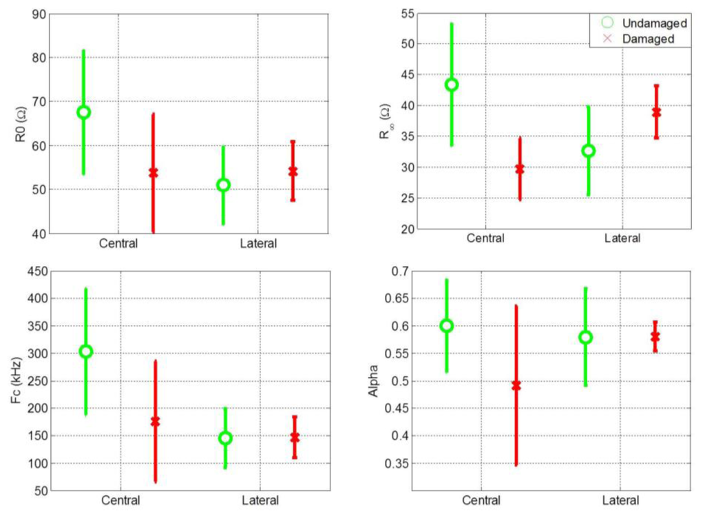 Cole parameters were extracted for all central and lateral measurements. The mean value and standard deviation of the Cole parameters for central and lateral measurements of both damaged and undamaged hemispheres are shown separately in Figure 2. Figure 2 shows that the distribution of the Cole parameter values exhibit a high variance. One reason for this high variance is the high variance among patients in the magnitude of the impedance recordings. It is also evident that comparing the Cole parameters individually for central and lateral measurements is not an effective procedure for distinguishing between healthy and damaged cerebral tissue.