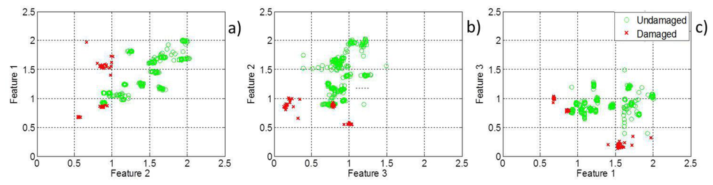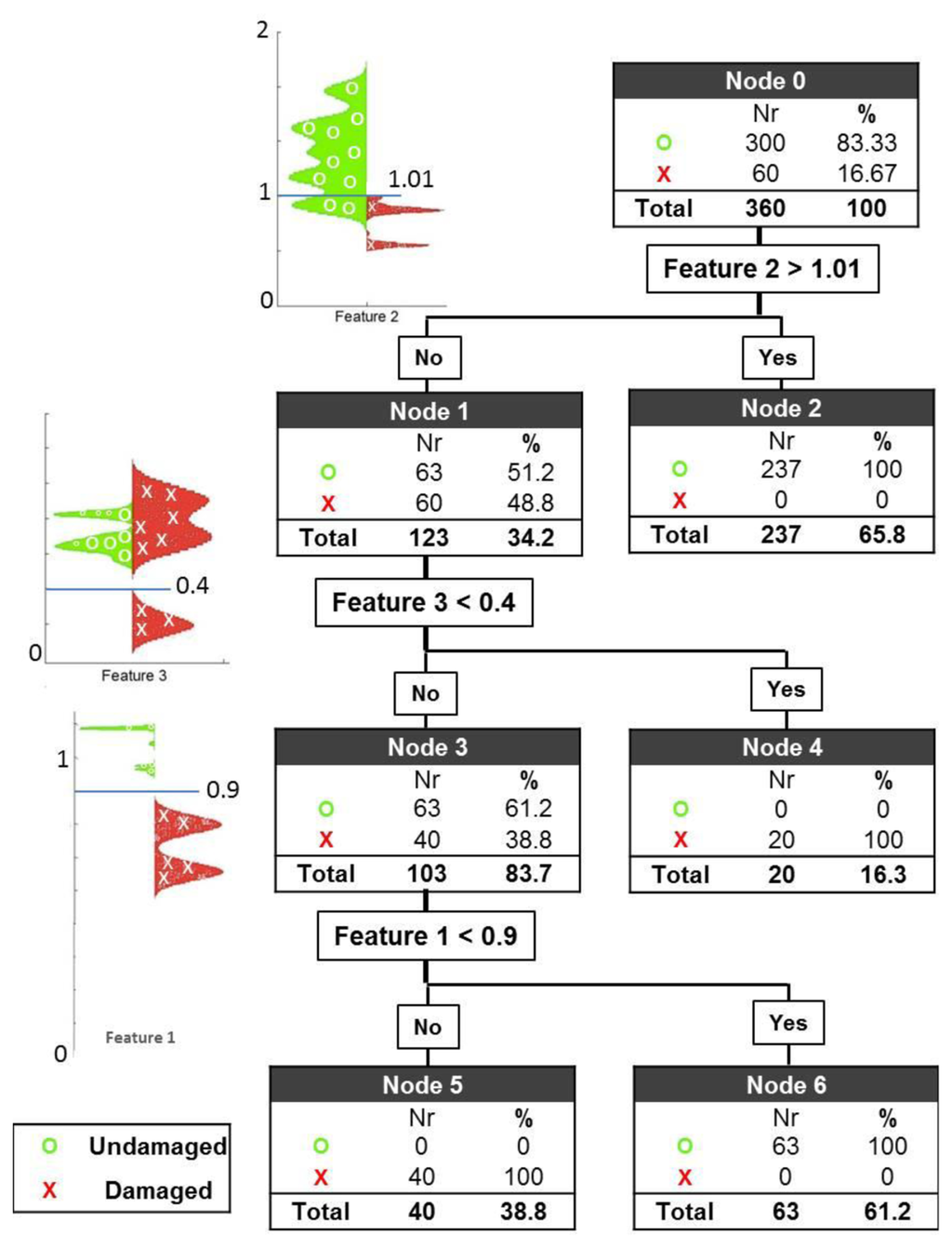 At the first node, the first threshold is set to 1.01 for Feature 2 with the expectation of classifying a cluster of healthy subjects. With the application of this threshold, 79% of the healthy cases are correctly classified, leaving 21% of the healthy cases and 100% of the damage cases for further evaluation. Applying the second threshold with the value 0.4 for Feature 3, 1/3 of the damage cases are successfully separated, leaving 28.6% of all the measurements (63 healthy cases and 40 damage cases) for further evaluation. At the last node, the third and final threshold is then applied to Feature 1, with a value of 0.9. The result of this evaluation is that all 63 healthy cases are classified correctly in node 6, and all 40 remaining damaged cases are also correctly classified in node 5.