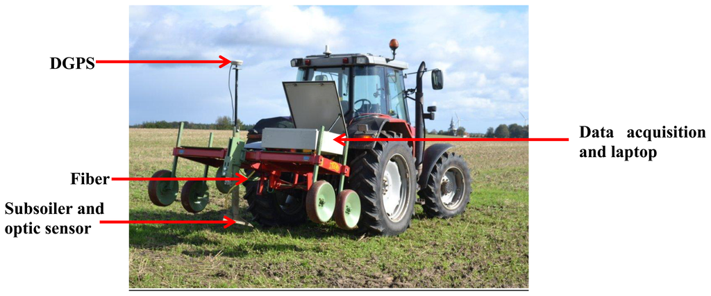 On-line vis-NIR soil sensor (Figure 1) developed by Mouazen [16] was used in this study. It consists of a medium-deep subsoiler, which penetrates the soil to a required depth, making a trench, whose bottom is smoothened by the downwards forces. It was set up to a frame, which was mounted on the three-point linkage of a tractor (Figure 1). In order to measure soil spectra in diffuse reflectance mode, an AgroSpec mobile, fibre type, vis–NIR spectrophotometer (Tec5 Technology for Spectroscopy, Oberursel, Germany) with a measurement range of 305–2,200 nm was used. It is fast, precise and robust, without moving parts, which makes it suitable to be permanently aligned on mobile machines. The light source is a 20 W tungsten halogen lamp illuminating the soil surface. The spectrometer was IP 66 housed, protected for harsh working environments [11]. A differential global positioning system (DGPS; EZ-Guide 250, Trimble, CA, USA) was used to record the position of the on-line measured spectra with sub-meter accuracy. A semi-rugged Panasonic laptop was used for control, data logging and communication. The spectrometer system, laptop and DGPS were powered by the tractor battery.