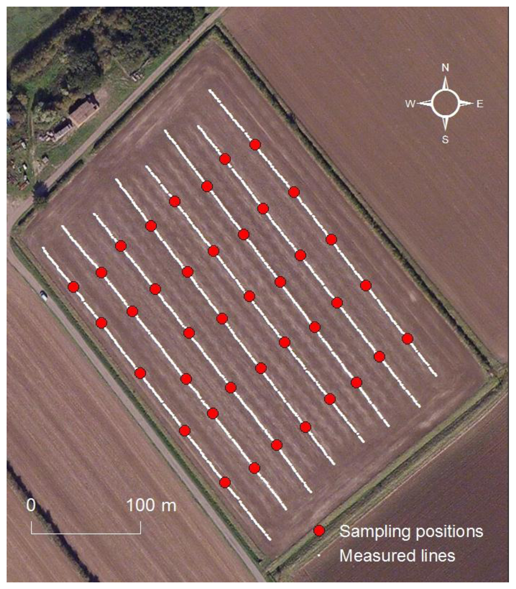 One field of 4.17 ha area was considered in this study. It is designated as Ten Acre Meadow field (Table 1) and belongs to the Duck End Farm in Wilstead, Bedfordshire, UK. The field was of clay soil, as shown in Table 1. During the field measurement that took place after crop harvest in the summer of 2012, the on-line vis-NIR sensor was pulled through eight adjacent lines of 20 m intervals at a travel speed of 2 km/h, setting the subsoiler at 15 cm depth. Five soil samples were collected from each transect from the bottom of the trench and the sampling positions were carefully recorded with the DGPS. A total of 40 soil samples were collected during the on-line measurement for calibration and validation (Figure 2).
