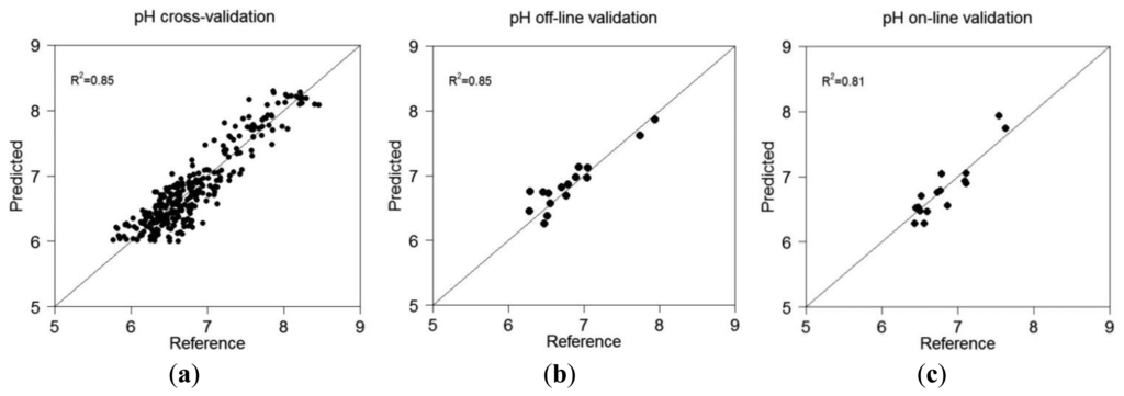Both off-line and on-line methods showed high prediction accuracy of pH with vis-NIR spectroscopy, which confirms the ability of vis-NIR spectroscopy to estimate pH having indirect spectral responses in the NIR range. However, a slightly higher accuracy was obtained with off-line (R2 = 0.85, RMSEP = 0.18 and RPD = 2.52), as compared to on-line (R2 = 0.81, RMSEP = 0.20 and RPD = 2.14) measured spectra of the validation set.