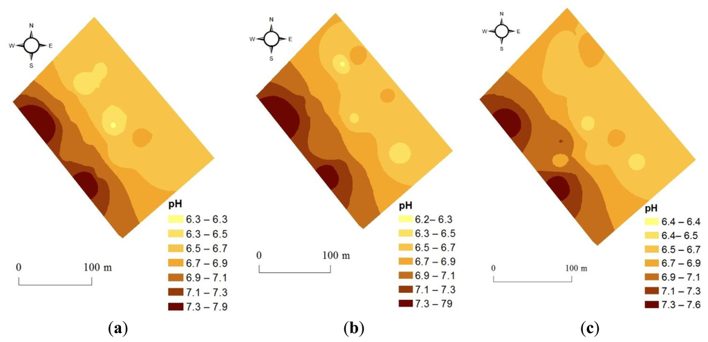 This full-point pH map illustrates high spatial variability across the field area (Figure 5), ranging from 5.84 to 8.29. This high variability enhances the need for on-line soil sensor for the detailed characterisation of within field spatial variability of soil properties, as zones with different levels of concentration should be managed differently in precision agriculture [11]. Higher pH values are observed along the south-west side of the field, whereas lower concentrations can be observed on the opposite side of the field. In fact, this field can be divided into two clear parts of high and low pH concentration. This clear division can be explained by the fact that there is a drainage gutter on the south-west side of the field where soil is well drained and soil acidity has been lowered significantly.
