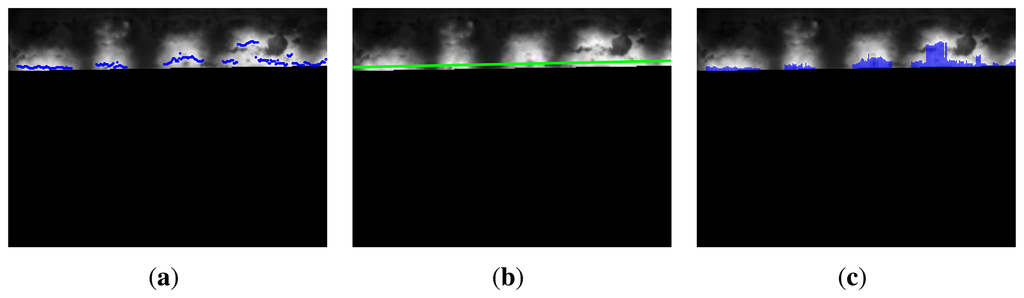 Figure 10(a) shows the position of the maximum temperature values in the flame front. Ideally, they should all be part of a straight line parallel to the the bottom limit of the ROI. In this case, the set of points could be fitted to a line (Figure 10(b)), and the coordinates of this line would be the features. However, as can be seen in the images, not all the points lie on this line. A better approach is to measure the distance from each of these points to the the bottom limit of the ROI, as shown in Figure 10(c).