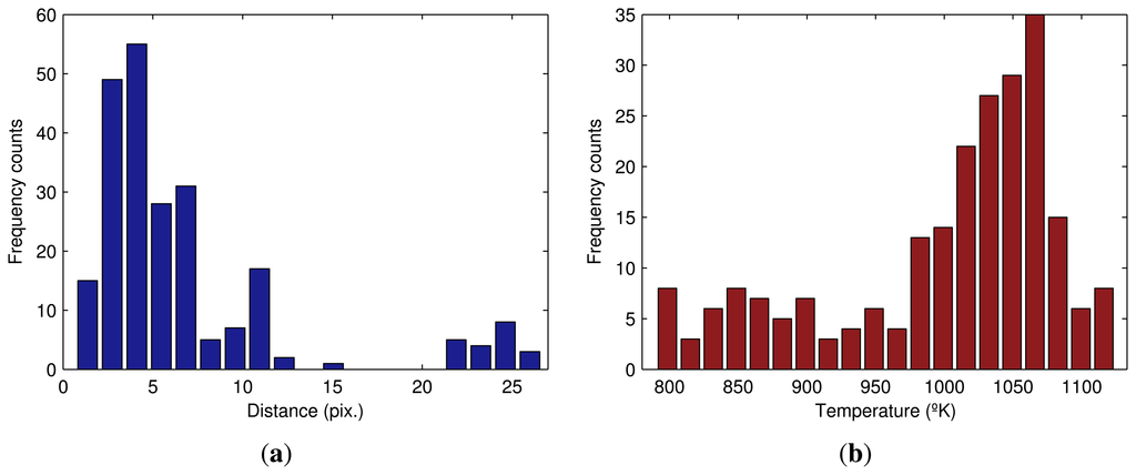 The best way to analyze the distribution of a set of points is with a histogram. Figure 11(a) shows the histogram of the distance from the maximum temperature values in the flame front to the bottom limit of the ROI. The frequent distances are very close to zero. However, some values on the right-hand section of the figure indicate spurious behavior. The BTP should have occurred before the discharge end of the sintering process, but in this part of the flame front, BTP has yet to occur. This means that in this zone, some of the material has not received proper heat treatment.