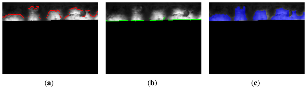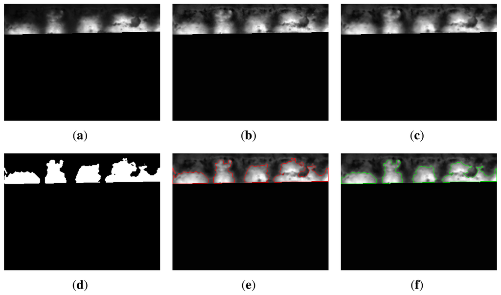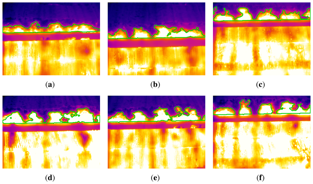 Figure 14 shows the segmentation results for the key frames shown in Figure 5. The ROI has been detected correctly. It is the bottom line of the flame front. From this division of the images, the segmentation procedure detects the boundary of the flame front accurately. The final results clearly identify the flame front in the infrared image.