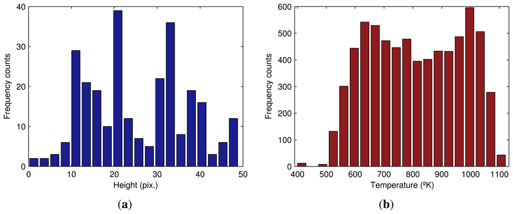 Another set of features can be extracted from the flame front zone. The first set of features is related to the heights of the zone. The heights of this zone can be computed from the binary image produced by the segmentation. The top and bottom limits of the zone are calculated (Figure 12(a,b)). Then, the distance is computed finding the difference between them (Figure 12(c) and Figure 13(a) show the histogram of the heights in the flame front).