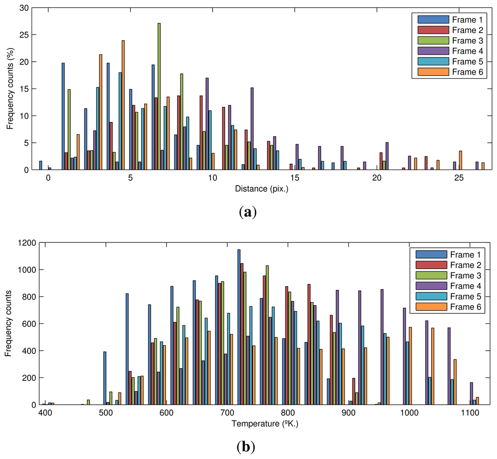 The final step of the proposed procedure is the extraction of features. Figure 15(a) shows a comparison of the distribution of distances from the maximum temperature values in the flame front to the bottom limit of the ROI for each key frame. In most of the frames, the distance is very low. As expected, at the end of the sintering process, the flame front is very close to the bottom of the sinter bed. However, there are cases, such as Frame 6, where there are long distances that could indicate anomalies in some areas of the sinter bed. Comparing these distributions can help to assess the BTP and to tune the sintering parameters.
