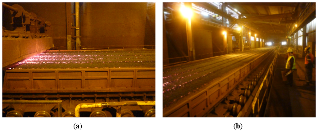 Figure 2 shows two images of the sintering process. Figure 2(a) shows the mixture just after the ignition hood. Figure 2(b) shows the sinter bed. As can be seen, the mixture is moved in a big structure, around one hundred meters long and three meters wide.