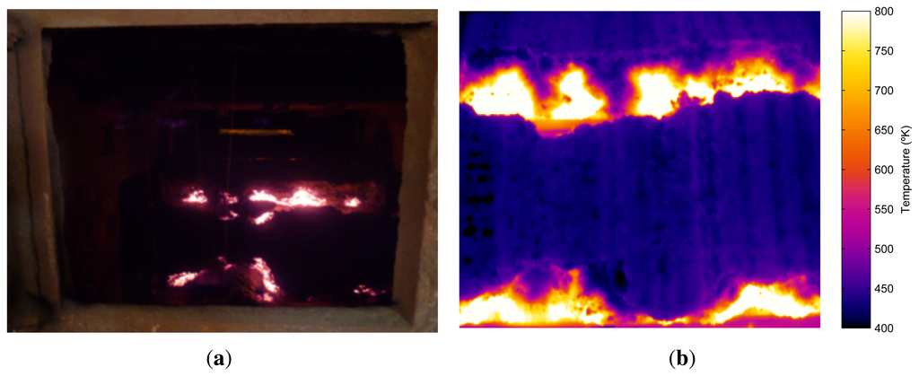 The camera used in the system is at the discharge end of the sintering process. The position of the camera can be seen in Figure 1. Figure 3(a) shows an image taken from this position in the visible spectrum. This image shows the flame front in the material, although in images taken in the visible spectrum, the position is barely appreciable. In contrast, Figure 3(b) shows an infrared image taken from the same position, where the flame front can be seen much more clearly. These images show why it is necessary to use infrared thermography. A sensor based on infrared thermography is not only able to measure the temperature of the flame front, but can also be used to detect the position of the flame front. This position is extremely important to determine the BTP and to regulate the process parameters that can be used to optimize sintering. The infrared camera used in this system is a Flir ThermoVision A325, which provides infrared images of 320 × 240 pixels. The maximum acquisition frequency of the camera is 60 Hz, i.e., a new image can be acquired every 16.67 ms. The temperature range is configurable within several available ranges. In the experiments, the range, [300, 2,000 °K], was selected. The manufacturer reports a measurement accuracy of ±2°K and a sensitivity lower than 50mK. The camera communicates with the computer using a dedicated Gigabit Ethernet cable. The long-wave infrared camera operates at eight to 12 μm. The camera is configured with an emissivity of 0.9, an estimated value for rough iron and porous materials, and adjusted using other readings.