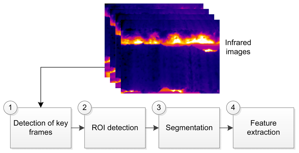 Sintering is a complex industrial process that applies heat to fine particles of iron ore and other materials to produce sinter, a solidified porous material used in blast furnaces. The sintering process needs to be carefully adjusted, so that the combustion zone reaches the bottom of the material just before the discharge end. This is known as the burn-through point. Many different parameters need to be finely tuned, including the speed and the quantities of the materials mixed. However, in order to achieve good results, sintering control requires precise feedback to adjust these parameters. This work presents a sensor to monitor the sintering burn-through point based on infrared thermography. The proposed procedure is based on the acquisition of infrared images at the end of the sintering process. At this position, infrared images contain the cross-section temperatures of the mixture. The objective of this work is to process this information to extract relevant features about the sintering process. The proposed procedure is based on four steps: key frame detection, region of interest detection, segmentation and feature extraction. The results indicate that the proposed procedure is very robust and reliable, providing features that can be used effectively to control the sintering process.1. Introduction