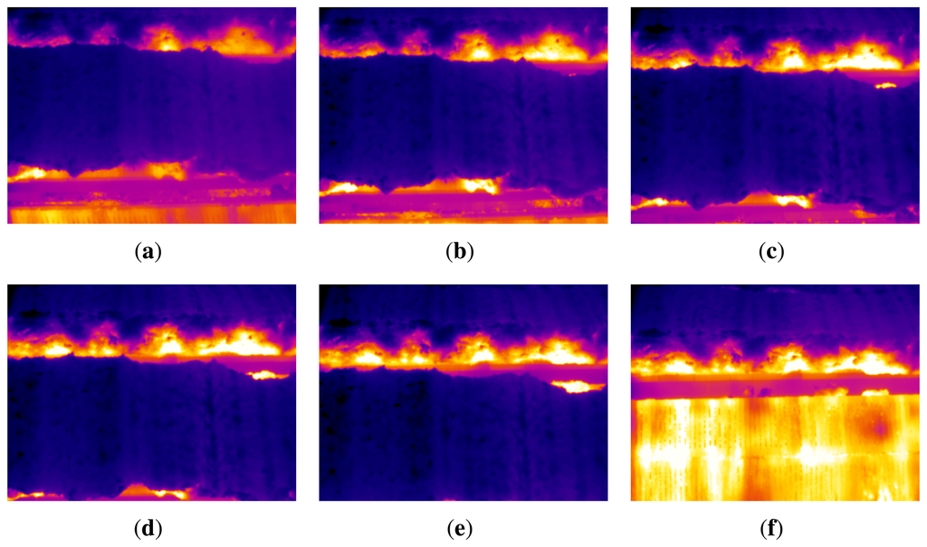 When the sinter is discharged, the temperature of the top layer of the sinter is much lower than the temperature of the sintering pallets used to move the material. Thus, when the sinter falls and the sintering pallets become visible, the average temperature in the infrared image is much higher. This can be seen in Figure 5. These images are shown using the same color scale as in Figure 3(b). Temperature in the sintering pallet is similar to the temperature in the flame front, while temperate in the top layer of the sinter is several hundred degrees lower. Figure 5(f) shows a key frame, where the sinter has just fallen, and the flame front is clearly visible. Furthermore, the average temperature in this frame is higher than the others. As the sinter moves, the sintering pallet will gradually be hidden again, and the average temperature of the image will decrease. Thus, the average temperature of the images is a good indicator to identify key frames.