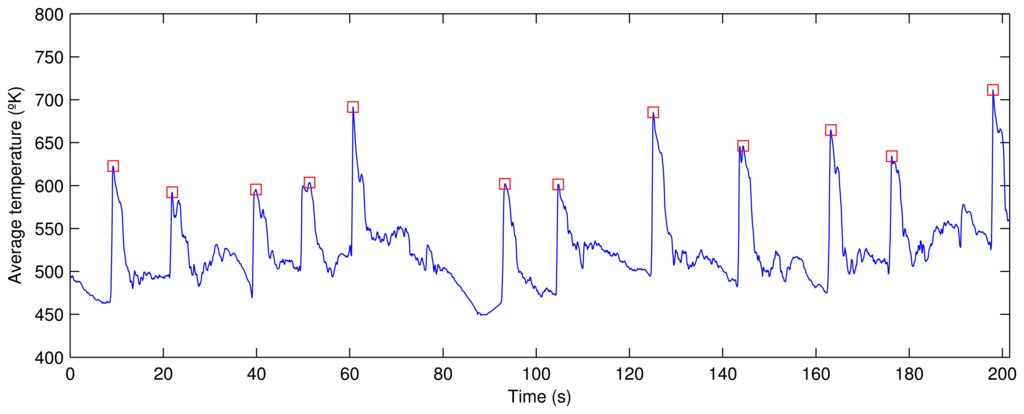 In order to detect the peaks in the average temperature signal, a procedure based on derivatives is used. The first step is to calculate the first derivative of the signal. Possible peaks are detected, because the first derivative of a peak has a downward-going zero-crossing at the peak maximum. However, the presence of random noise causes many false zero-crossings. Possible peaks are filtered based on two conditions: the slope must exceed a minimum, and the original signal at that point must exceed another minimum value. In this way, small peaks are ignored. Figure 6 shows all the peaks detected in the average temperature signal using this procedure. The proposed procedure is very robust and provides very good results under different conditions. When this procedure is applied in real time, a very small delay is necessary to calculate the first derivative with a window centered around each point, but this does not affect the results.
