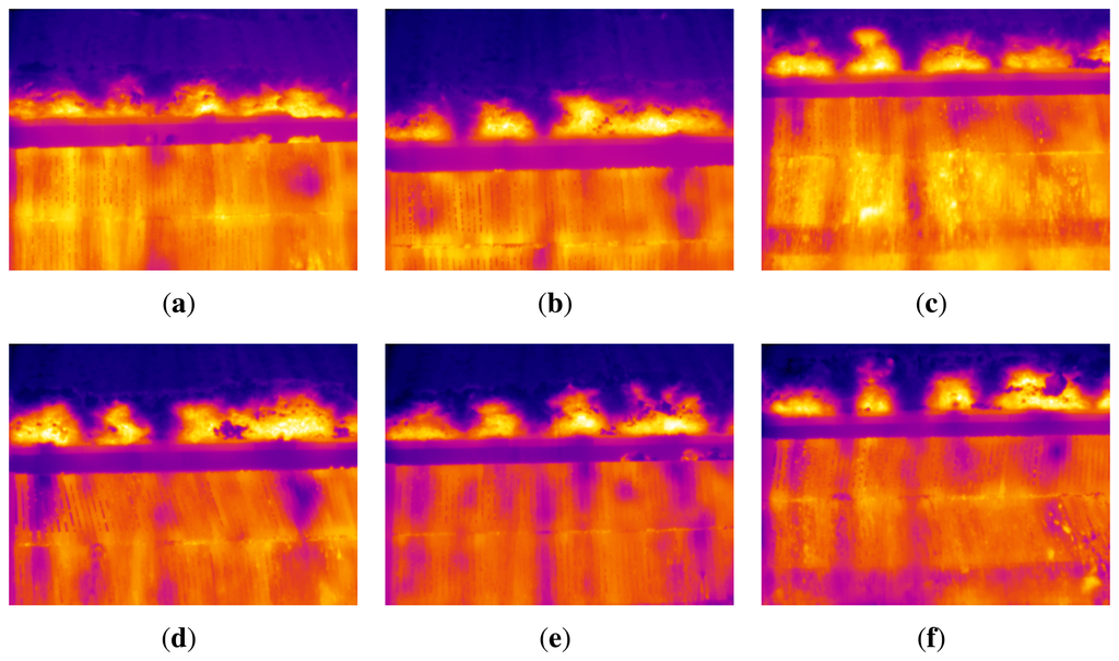 The position of the peaks in the average temperature signal makes it possible to identify the key frames in the sequence of infrared images. The position of a peak corresponds to a key frame. Figure 7 shows some of these key frames. These are the images where the flame front is best seen and, thus, the images used for the subsequent processing. Figure 7(f) will be used as an example to describe further processing.