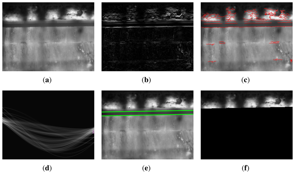 Using the top line detected by the Hough transform and the described lookup table, a new line is calculated: this line corresponds to the bottom of the sinter bed in the image. Figure 8(e) shows the ROI in the image, that is, the part of the image above this line. The rest of the image is removed and will be ignored in the next steps.