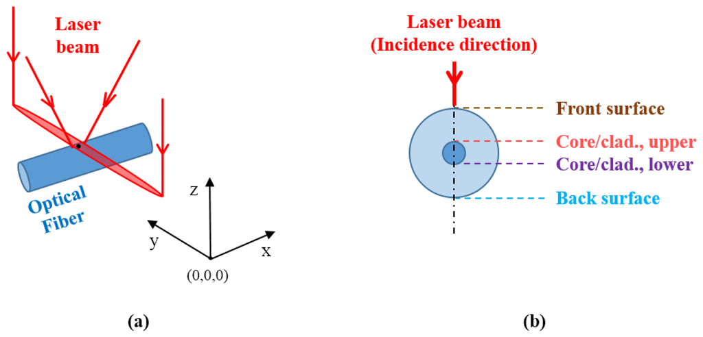 Considering a silica-based single mode optical fiber under tension irradiated by an elliptical 10.6 μm wavelength CO2 laser beam (Figure 1), two main phenomena must be considered: the thermal heating due to the interaction between the photons and the glass molecular structure and the stress due to the differences between a relatively low-viscosity doped silica core and a relatively high-viscosity pure silica cladding [16].