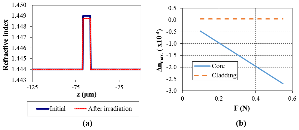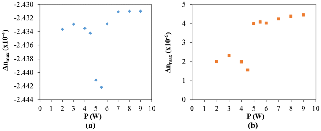 For the considered example, at t = 0.6 s, axial residual thermal stresses values along z-axis were determined as having a maximum of about −0.8 MPa. Axial elastic stresses act in the opposite direction and were calculated as being σx,co = 35 MPa and σx,cl = 0.153 MPa. The resulting refractive index change (the difference between final and initial values) is calculated to be in the order of −2 × 10−4 for the core and 4 × 10–6 for the cladding. The refractive index distribution in the fiber (along the z-axis), before and after the laser irradiation is showed in Figure 9a and the maximum refractive index change (core and cladding) for different draw forces is plotted in Figure 9b. Figure 10 shows the calculated (maximum) refractive index change at the core and cladding for different laser power. Under the considered conditions, even if the refractive index of the core shows minor changes by increasing the laser power, it is possible to observe the beginning of the contribution of thermal stresses around 5 W. This is clearly observed regarding the refractive index change for the cladding, where a well-defined step occurs between 4.5 W and 5 W.
