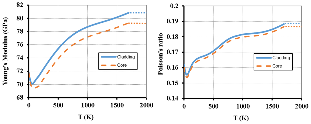 The optical fiber is a Corning SMF-28 fiber (125 μm diameter pure fused silica cladding and 8.2 μm diameter core of 3.5 mol% Ge-doped SiO2) [28]. Figure 2, Figure 3 and Figure 4 show the change on the different parameters with temperature. For some parameters (shown in Figure 2), the temperature dependence was modelled using native COMSOL functions for a Corning fused silica glass (7940). The doping effect on most of the parameters was disregarded mainly because the Ge concentration in the fiber's core is very low [29]. However, for the Young's modulus and Poisson's ratio (Figure 3), we extrapolated the function behavior [30]. Furthermore, the heat transfer coefficient was considered h = 418.68 W·m−2·K−1 [22] and R = 0.15 [31].