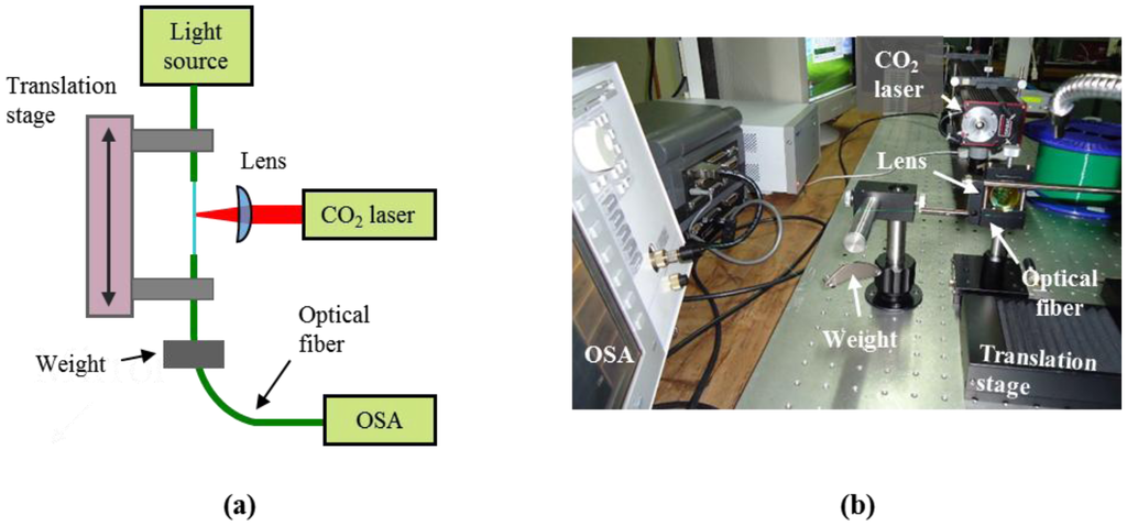 In order to induce a constant strain to the fiber, a small weight (usually, several tenths of gram) is attached on one of the sides of the fiber, suspended. A broad band light source (Thorlabs S5FC1005S) and an optical spectrum analyzer (OSA, Agilent 86140B) allows monitoring the LPFG fabrication, while a fast camera (PCO SensiCAM), perpendicular to the irradiation axis, was used to optically visualize the process. The irradiated zones were analyzed through an optical microscope (Zeiss AxioScope A1) with maximum amplification of 1,000×.