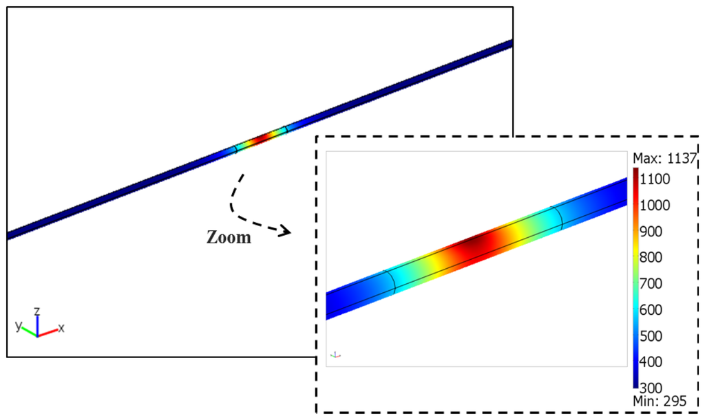 Figure 7 shows the plots resulting from the simulation using Equation (5) under the conditions mentioned before for the irradiated front surface, core/cladding interfaces (upper and lower) and the back surface of the fiber (Figure 1), and x = y = 0 m. In Figure 7a, the duration of the simulation was made larger than the laser emission duration in order to visualize the cooling process. The plot in Figure 7b, representing the variation of temperature along the fiber's axial direction, shows that the temperature was slightly larger than 1,050 K at the interfaces between the core and cladding, and one could assume that the core could be considered as being at the same temperature. This assumption cannot hold for the cladding since its temperature varied about 100 K along its thickness.