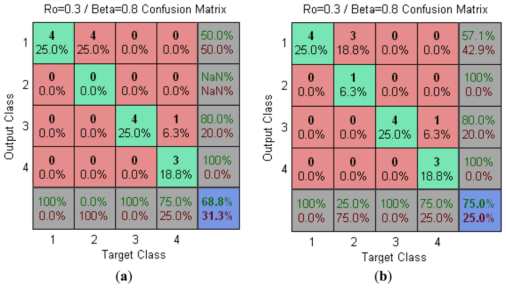 As mentioned above, a Cross Validation with seven electrodes has a 100% recognition rate when validating with samples M3 and M4, with a mapfield of 1 × 4. A 100% recognition rate has also been obtained with the Stepwise PPN method when working with Au, Ag, Cu and CuO2 electrodes. In this way, our decision was to combine the training with samples M1, M2 and M5 to M8, and test the model with samples M3 and M4 by using just Au, Ag, Cu and CuO2 sensors; then, the values for the new training were [0.1–0.3] for ρ and [0.7–0.8] for β, having increments of 0.05 for both parameters.