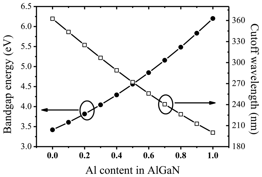 Figure 1 shows the relationship of bandgap energy (cutoff wavelength) of AlxGa1-xN semiconductor with Al mole fraction. As can be seen, to realize solar-blind detection, the Al composition in AlxGa1-xN should be higher than 40%. High-quality AlGaN films are the key element in obtaining high-performance photodetectors. Compared to GaN, the growth of AlGaN especially with a high Al amount has proved to be significantly difficult, which lies in the lower migration of Al atoms than that of Ga atoms, and strong parasitic reactions. Therefore, the layer-by-layer growth with the atomic steps on the surface for the films is difficult to achieve compared with the well-developed GaN template. As a result, high-density defects, such as dislocations, grain boundaries, or stacking faults, are much easier to generate [21].