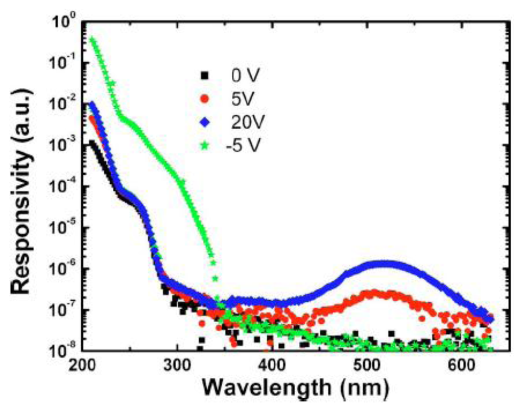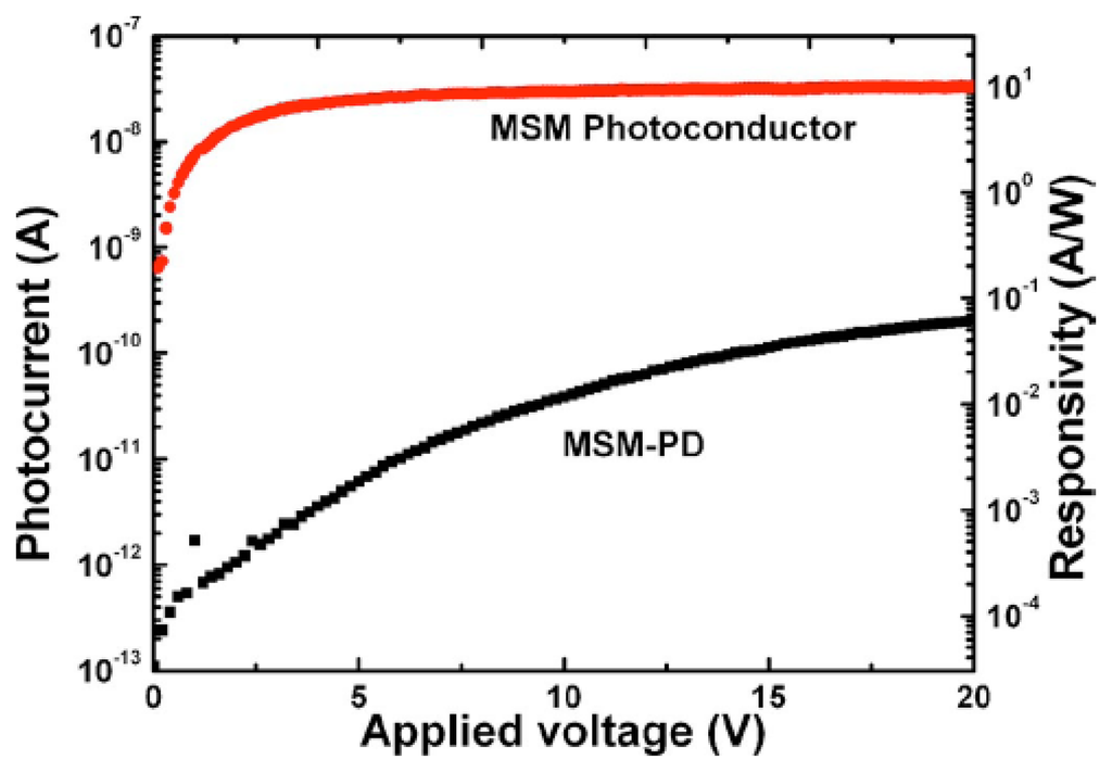 It was demonstrated that this device could be operated in both reverse and forward modes for high speed and high responsivity, respectively. It combined the advantages of the MSM photodiode and photoconductor. This device structure enables the operations in both photoconductive mode with large photocurrent gain and depletion mode with fast response speed. Figure 14 shows the spectral response from the devices under both forward and reverse voltages, indicating a good performance as both the photoconductor and photodiodes.