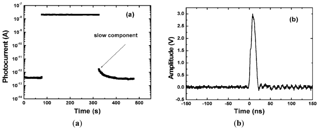 Figure 11 presents the I-V characteristic of the MSM photoconductor upon 220 nm light illumination in comparison with a typical as fabricated MSM photodiode. A responsivity of 6 A/W at 220 nm was obtained for the photoconductor at a bias of 3 V, indicating a gain of 33, if assuming the external quantum efficiency unity. The diamond photoconductor also illustrated a fast response speed, as shown in Figure 12.
